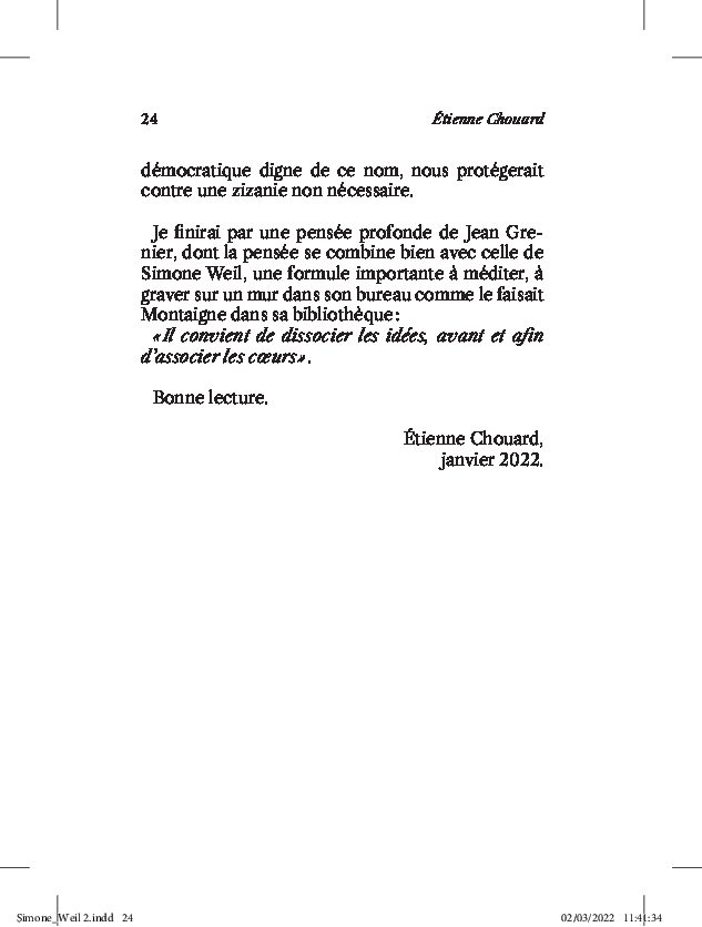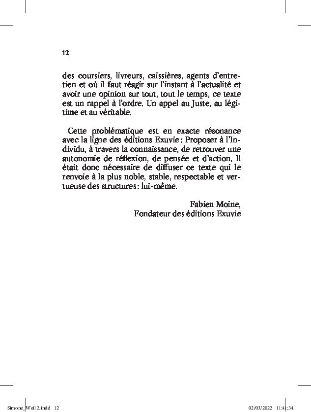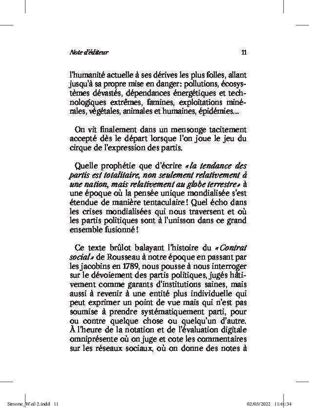 Cet opuscule d’une quarantaine de pages est en réalité un texte écrit en 1940 par la philosophe et mystique Simone Weil, à une période historique très forte. Ce livret est la reproduction d’une note nommée “Note sur la suppression générale des partis politiques” où la jeune femme y détaille son engagement humaniste à vouloir un individu libre et autonome dans son action.