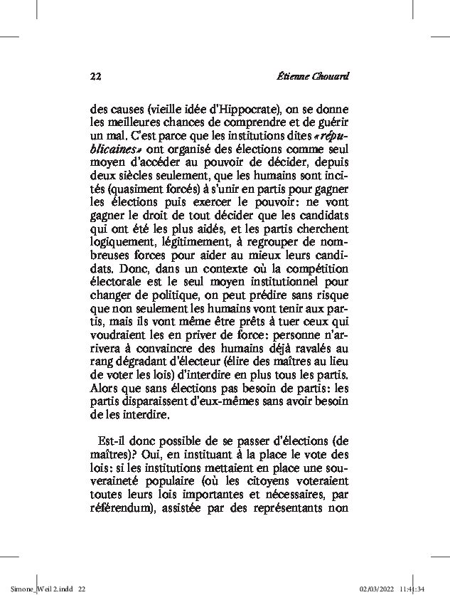 Note sur la suppression générale des partis politiques est un texte direct et quelque part radical qui nous pousse à nous questionner sur la direction de nos institutions. Il permet aussi de relativiser la puissance d’un parti, qui n’est qu’un point de vue nous obligeant à justement prendre parti, parfois pour, en tout cas, toujours contre quelque chose ou quelqu’un d’autre. Et à une époque où l’évaluation numérique est omniprésente, ce texte vieux de quatre-vingt ans n’aura jamais semblé aussi actuel.